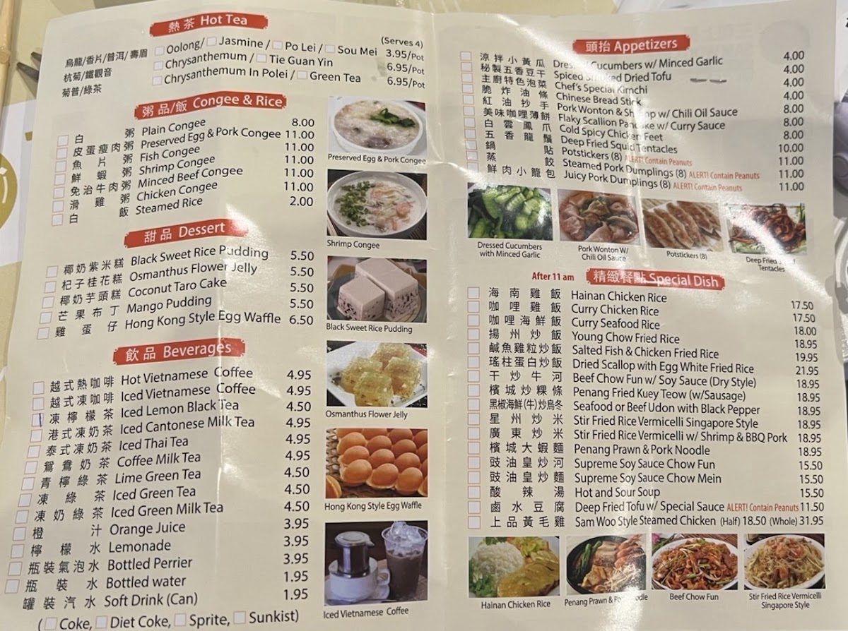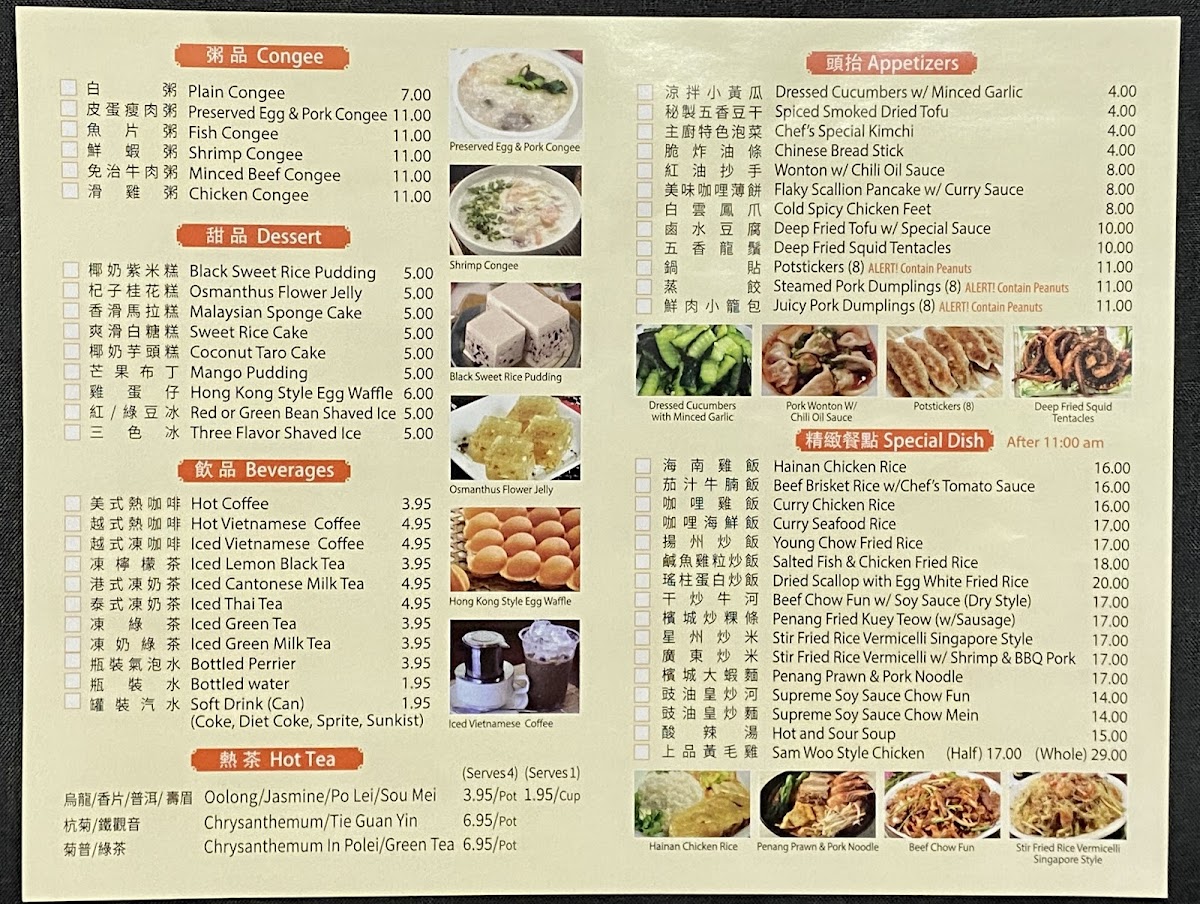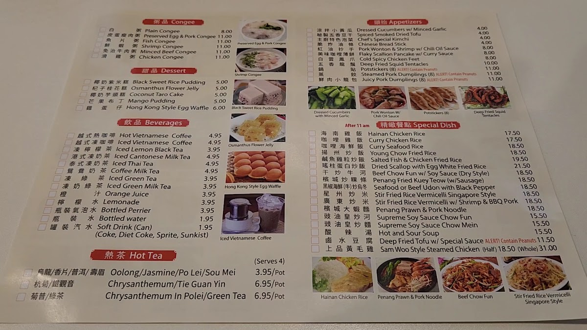 - Specialty Dishes: A selection of main courses like Hainan chicken rice, curry chicken and seafood rice, fried rice varieties including Young Chow and salted fish with chicken, as well as noodle dishes such as beef chow fun and seafood udon with black pepper.