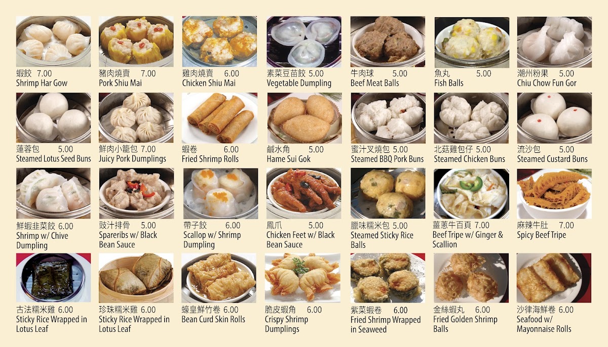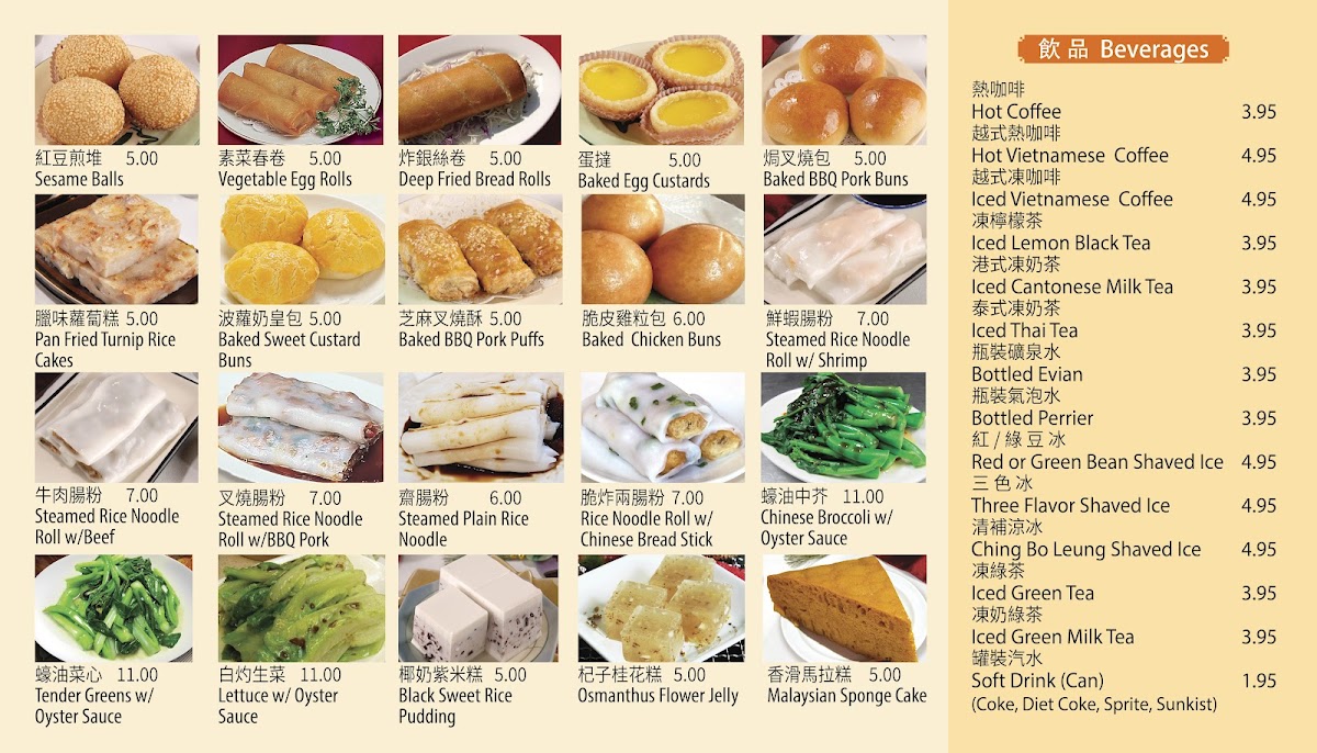 This menu is well-suited for customers looking for traditional dim sum throughout the day, quick lunch options, or casual dining with a variety of Chinese fast food choices. The availability of both savory dishes and sweet dim sum items allows for a diverse dining experience, with additional beverage options supporting both hot and cold drink preferences.
